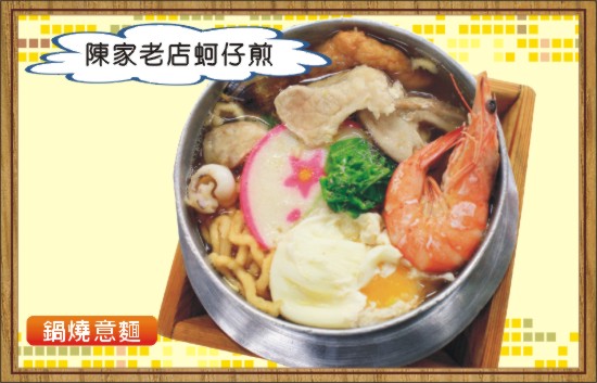 以蚵仔煎起家的陳家老店,蚵仔煎的美味度自然不在話下,而另一項人氣商品鍋燒意麵,不加味精,使用蛤蜊、柴魚、豬大骨熬煮湯頭,加上多樣配料,更是美味。不怕吃生蚵者,也可點一盤淋著特製醬料的生蚵,酸甜口感更對味。